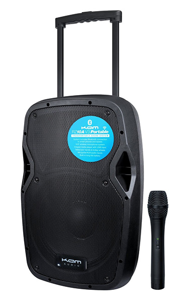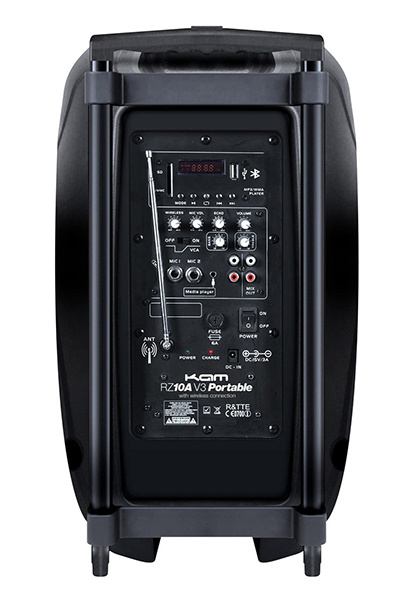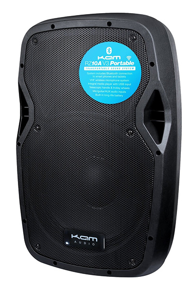 Kam RZ10A V3 Portable is a full-featured portable PA that includes a media player, USB & SD card input, a VHF wireless microphone system, and Bluetooth connectivity.