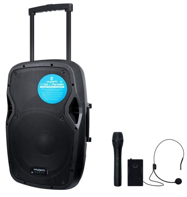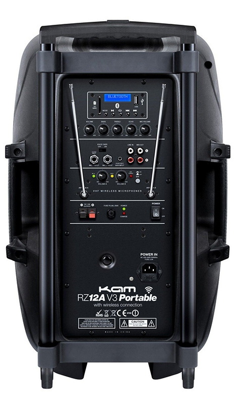 The Kam RZ12A V3 Portable is an all-in-one portable PA that includes a media player, USB & SD card input, a VHF dual-microphone wireless system, and Bluetooth connectivity.