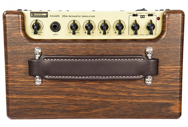 The KAA25 is fitted with a comfortable carry handle, while wooden side panels, chickenhead control knobs and brown grill cloth featuring the distinctive Kinsman logo round out the amp's classy appearance.