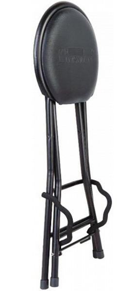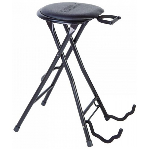This innovative stool is ideal for stage and home use, features a convenient built in universal guitar stand with foam tubing preventing scratches on your instrument, and a retractable neck cradle with safety lock. It has a large and padded seat, slightly angled providing extra comfort while playing. It collapses to a flat size when not in use, for easy transportation.