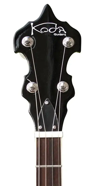 The Koda 4 String Banjo has a Mahogany Neck and Resonator, a Rosewood Fingerboard with Decorative Inlays, a 19-fret, 30-bracket Tenor Banjo, and a Rosewood Fingerboard. Pearlized buttons on geared tuners.