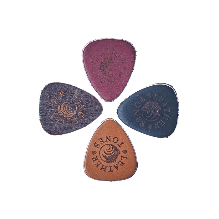 The Leather Tones Mixed Tin includes 3.3mm Whisky & Brown Leather and 3mm Black & Cognac Leather, ideal for Ukulele and Bass Guitar. The soft leather offers a warm tone for strumming and bass picking, with a large grip area for comfortable, aggressive strumming.