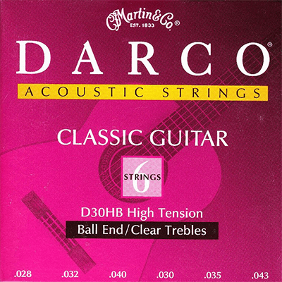 Darco by Martin strings feature silver-wound nylon cores for the bass (E, A, D) and clear nylon trebles (G, B, E). They are high tension with ball ends.
