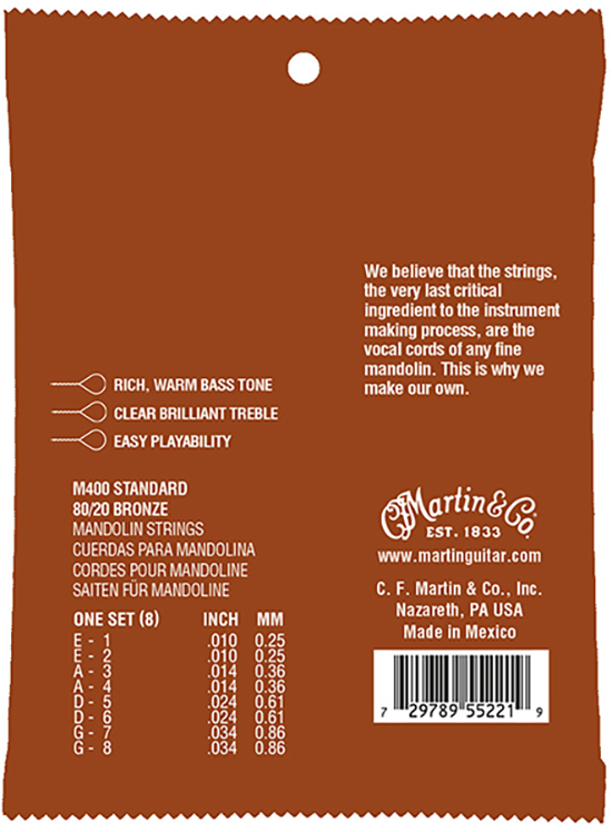 Play the mandolin with speed and ease. This beautiful instrument is a key part of American Bluegrass bands. Martin Mandolin strings are designed to deliver rich, warm tones and bright, long-lasting trebles.
