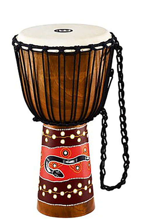 The Meinl HDJ5-L Python features an eye catching hand painted dot design, in vibrant lively colours. This Djembed was carved from a solid piece of plantation grown Mahogany, ensuring high quality on its tone and durability. The HDJ5-L uses the Mali Weave tuning system, that secures and tunes the goat skin head..