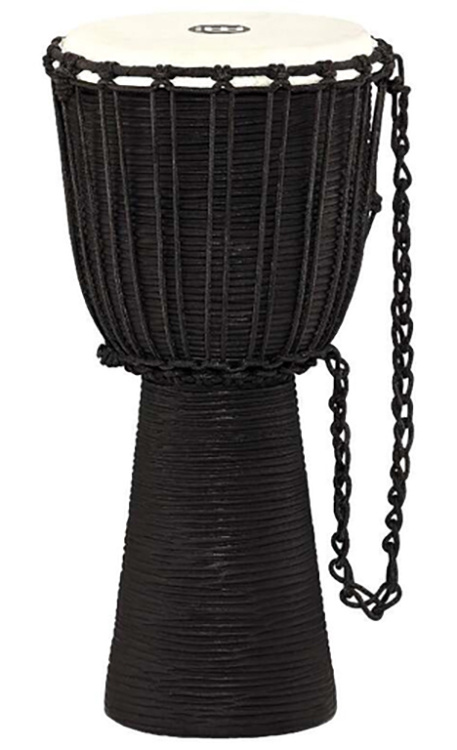 These Djembes are made from a solid piece of plantation-grown Mahogany wood and are hand-carved with a horizontal ripple motif that suggests a flowing river. This also makes the djembe easy to grip between the knees. The hand-selected goatskin head is secured and tuned with the traditional Mali Weave system.