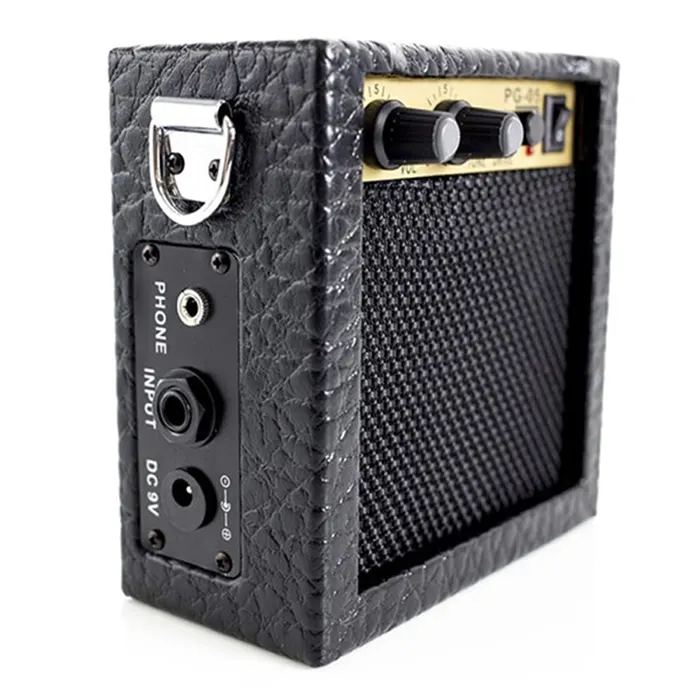 This mini amplifier packs a real punch with volume, tone, and overdrive controls—perfect for use with an electric guitar. It has a 6.35mm jack connecting a guitar or other instrument to have a more powerful sound. It also has a 3.5mm headphone jack. Powered by a 9V battery (replaceable) or mains adaptor (not supplied but readily available on the high street), it outputs 5W of power through its integrated speaker and can also be used with headphones. It measures just 5x5x2-½" and weighs a little over 1 lb, so you can take it wherever you go.