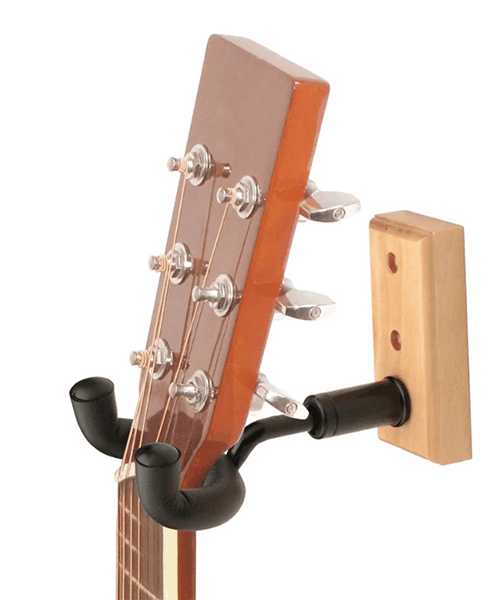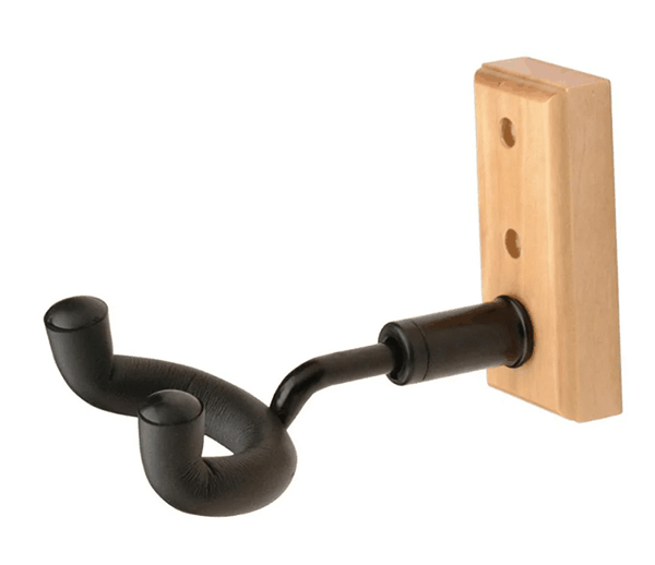 The GS7730 Wooden Wall-Mount Guitar/Ukulele Hanger keeps a small stringed instrument readily accessible while storing it safely. It saves space by doing away with the requirement for a floor stand and firmly supports a guitar by the headstock when mounted to a wall. Instruments with symmetric or offset headstocks can hang straight thanks to the swiveling yoke. Padding is placed on the stable steel yoke to keep the device securely in position and preserve the instrument's finish. Hardware is supplied for simple, efficient installation.