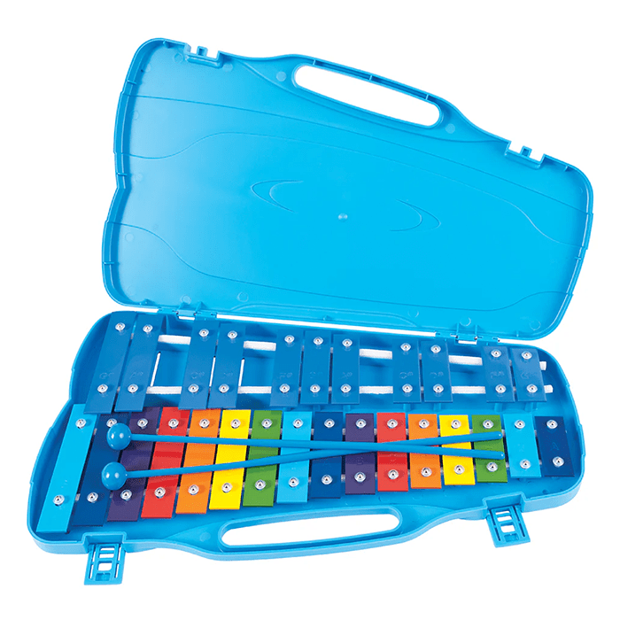 PP G5-A7 27 Note Glockenspiel, Coloured Keys is an affordable glockenspiel perfect for beginners and advancing students. Bright, durable, and consistently tuned, they help introduce musical harmony to young players. Each comes with quality metal keys, two beaters, and a sturdy carrying case for easy transport.