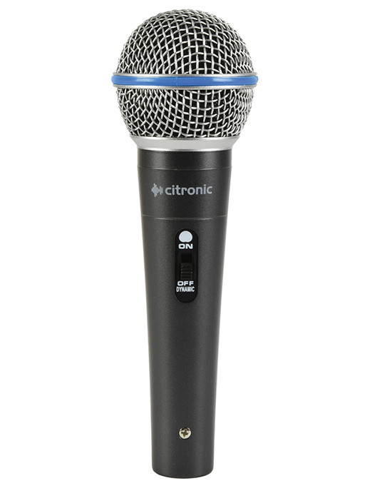 Handheld vocal microphone with precision-machined metal body and resilient dynamic capsule. Features a built-in on/off switch, ideal for vocal and karaoke applications.