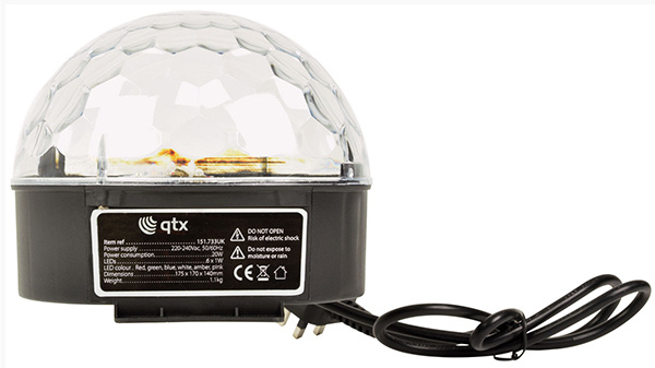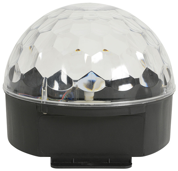 A tabletop LED light effect produces a dynamic ceiling display with a sound-sensitive auto sequence by using 6 x 1W LEDs to produce colorful beams that are refracted through a rippling dome. For home discos and gatherings, the fixture can also be installed on a wall or ceiling to shine onto a wall or floor.