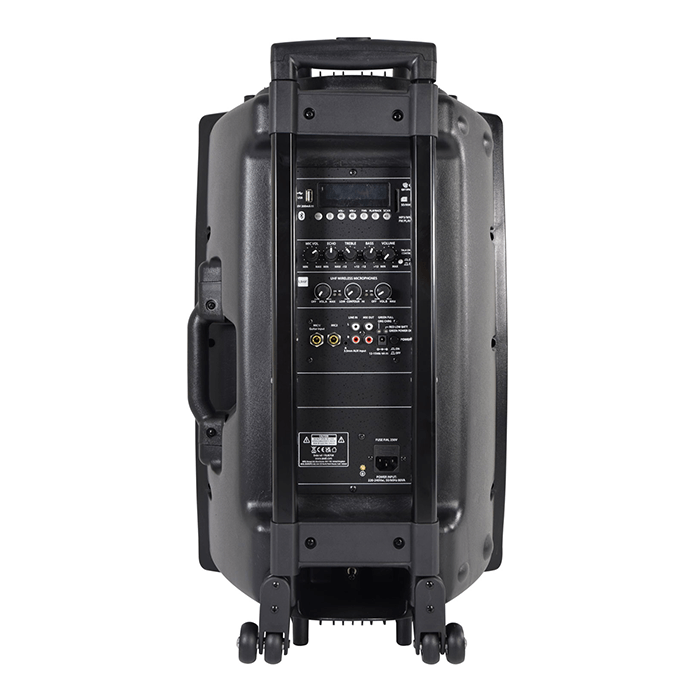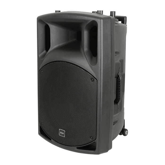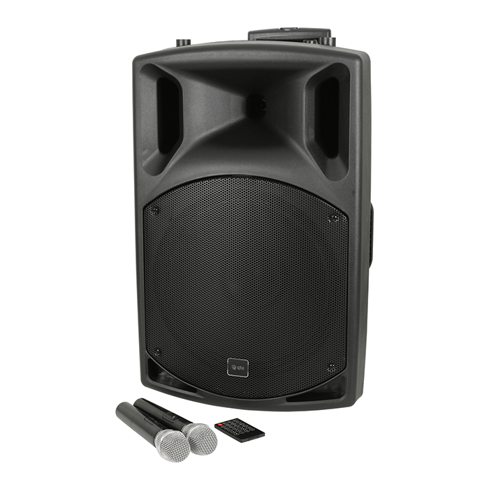 The QTX QX15PA Plus stands as a complete portable PA system suitable for events and both presentations and concerts. This portable system comes with an integrated amplifier that powers a 15” speaker with a compression-driven horn, and it can work using standard power or rechargeable battery options for complete versatility. The system delivers a complete audio solution through its combination of UHF handheld wireless microphones plus Bluetooth functions and a USB/SD/FM media player. Transportability through the retractable trolley handle makes this device simple to move alongside rear wheels, and its capability for 35mm pole mounting allows quick setup at different locations.
