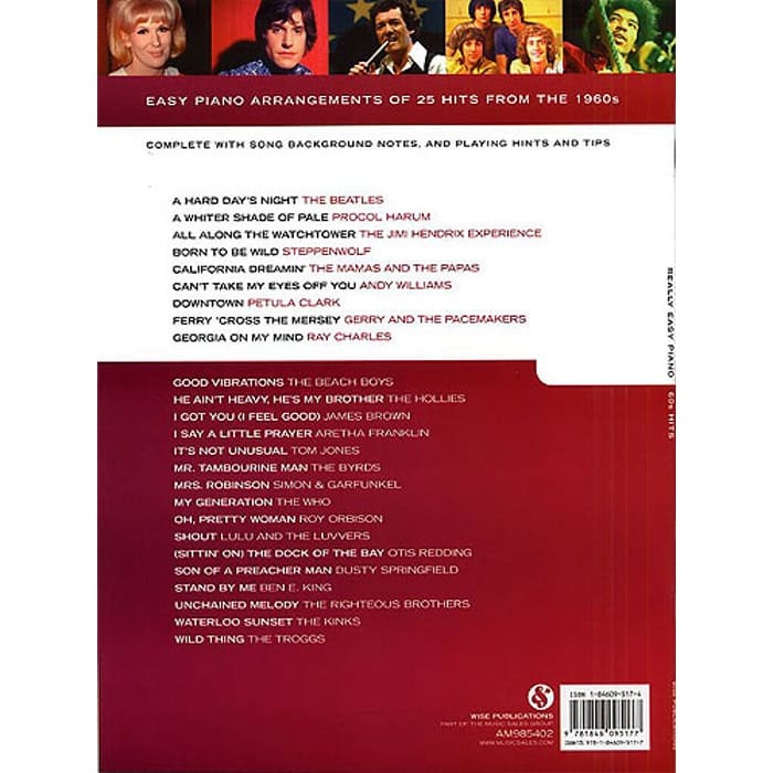 The Really Easy Piano: 60's Hits book offers 25 classic songs arranged for beginners. It includes melody lines, lyrics, chords, background notes, and simple playing tips to support learning.