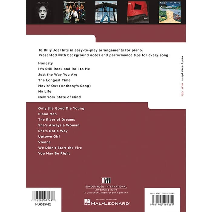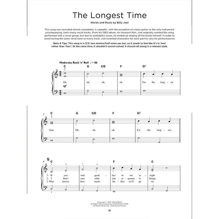 Really Easy Piano: Billy Joel contains 16 iconic songs arranged for beginner pianists. Each piece includes full lyrics, helpful background notes, and performance tips to make learning easier. Students with 1-2 years of piano experience can practice both treble and bass staves, while chord charts offer opportunities for left-hand improvisation.