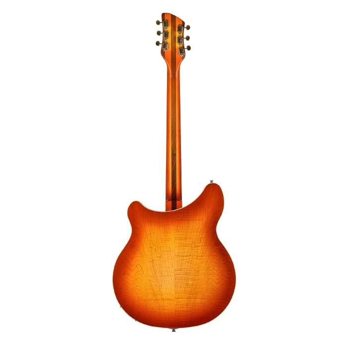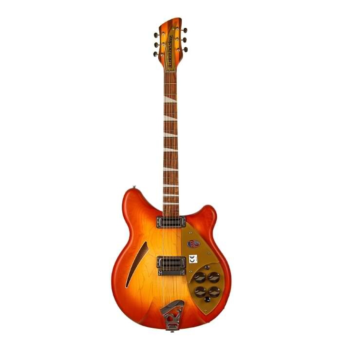 The Rickenbacker 360 Satin Autumnglo is a semi-acoustic guitar crafted from a maple body with a maple and walnut neck, paired with a rosewood fingerboard featuring signature triangle inlays and neck binding. Equipped with two hi-gain pickups, it delivers bright highs and warm lows, supported by mono and stereo outputs for versatile performance. A 6-saddle bridge with the iconic ‘R’ tailpiece ensures accurate intonation, while Gotoh machine heads provide stable tuning. Finished in Satin Autumnglo to highlight the natural wood grain, this lightweight 3.6 kg guitar combines striking style with outstanding playability.