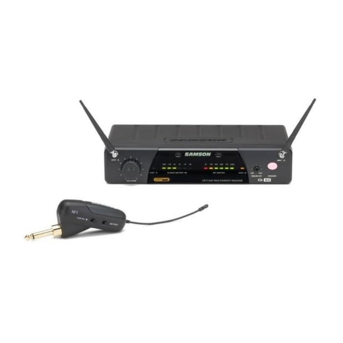 The Samson Airline 77 Wireless Guitar System E3 gives guitar and bass players true wireless freedom. The AF1 transmitter plugs directly into the guitar with no belt pack or cable. It runs up to 14 hours on one AA battery. The CR77 diversity receiver provides a stable UHF signal with clear LED meters and simple controls. Balanced and unbalanced outputs allow easy connection to amps or mixers.