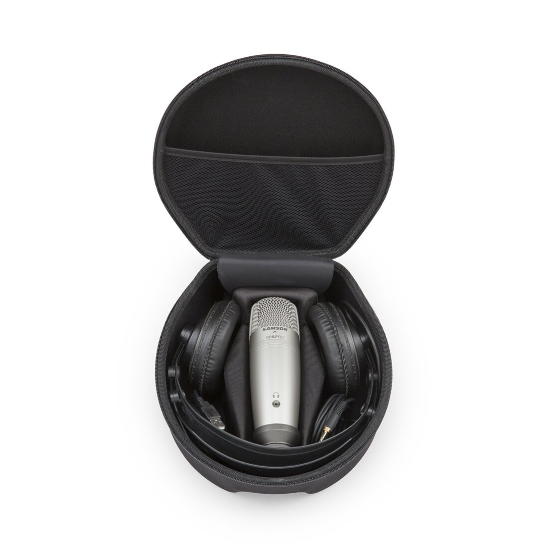 The Samson C01U Pro Podcasting Pack gives you all the tools you need to record at home or on the go. It includes the C01U Pro USB condenser mic, SR850 studio headphones, a desktop stand, a USB cable, and a carry case. The mic delivers clear sound and works with Mac, PC, and iOS devices through plug and play connection. The headphones provide accurate monitoring, while the stand keeps the mic stable.