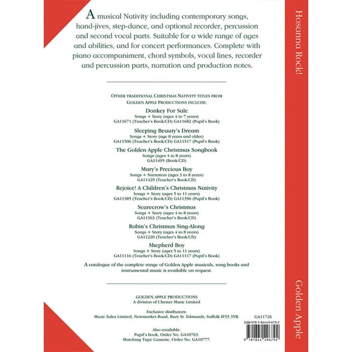 Hosanna Rock! (Teacher's Book/CD) is a fun, easy-to-teach Christmas musical for children aged 5–10. It includes songs, dance routines, and optional instrumental parts for a lively 30-minute performance, complete with a teacher’s guide and student script.