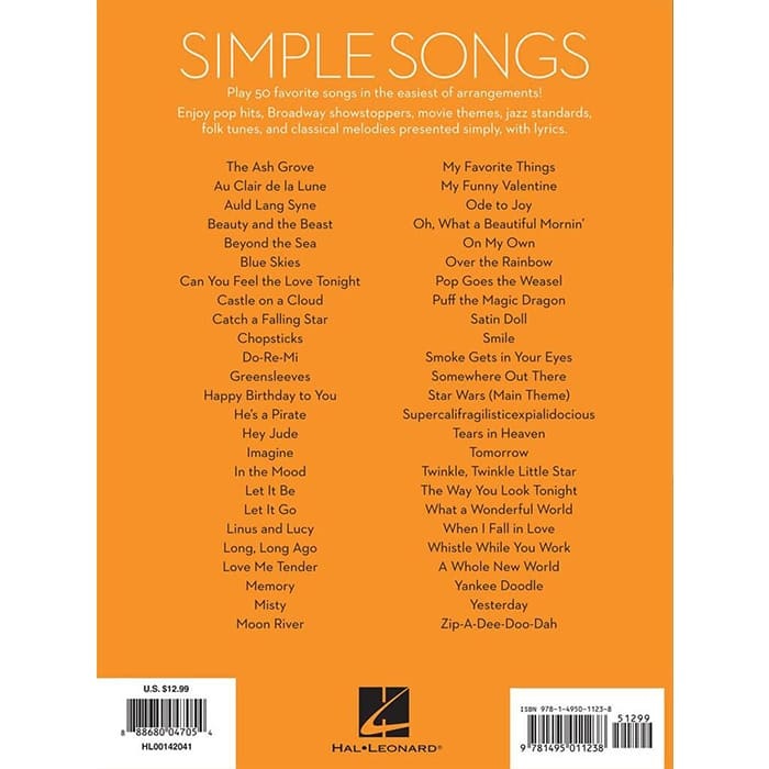 Simple Songs - The Easiest Easy Piano Songs features 50 beginner-friendly arrangements spanning pop, Broadway, movie, jazz, folk, and classical music. Includes lyrics for sing-along fun and easy-to-read notation.