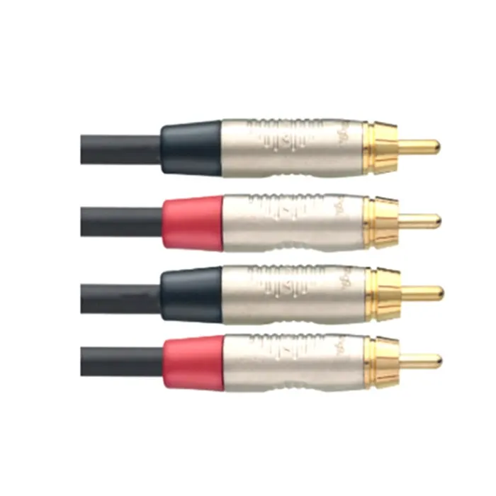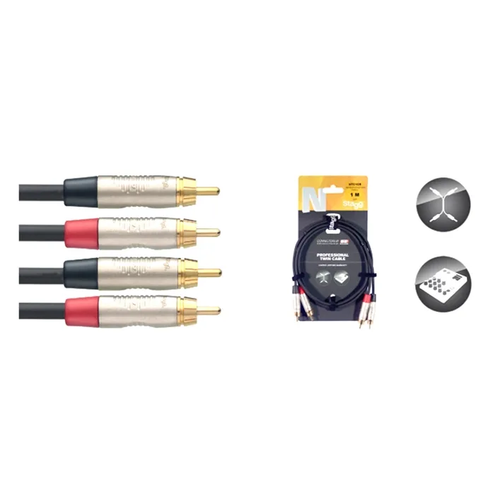 The Stagg 1M/3FT Twin RCA Cable connects through REAN male-to-male RCA connectors designed for robust audio signal transmission. The RoHS-compliant black cable extends to one meter (3 feet) which suits different audio configuration needs perfectly.