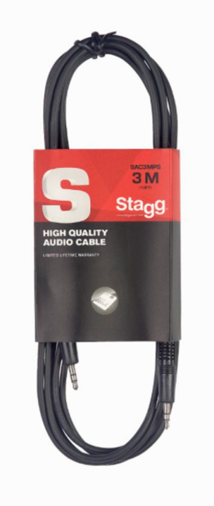 Stagg 2M / 6FT Audio Mini Stereo Plug (SAC2MPSMPSB) connects audio devices with clear stereo sound. It features a durable black design, 3.5mm connectors, and RoHS-compliant materials.