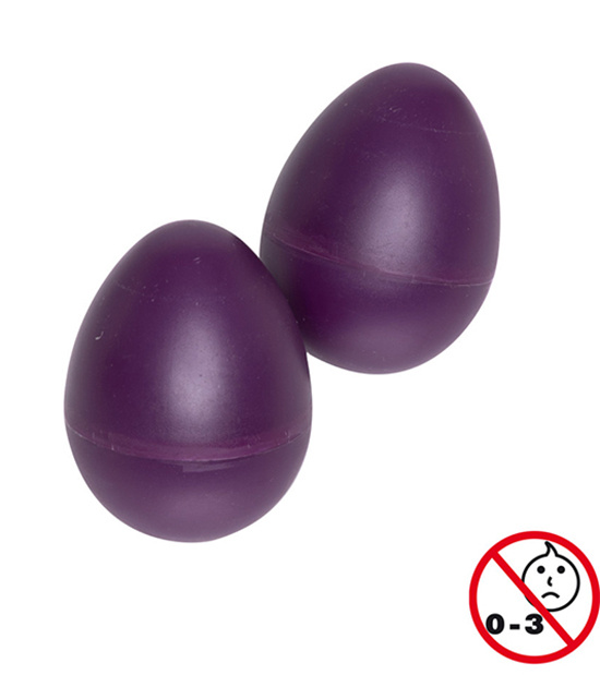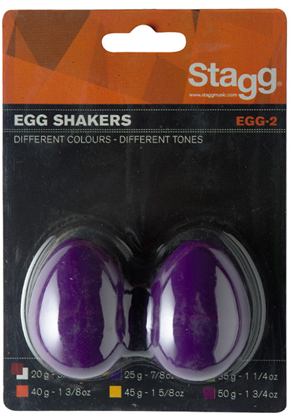 The Stagg 2pc Egg Shakers in vibrant purple are made from durable plastic and weigh 7/8oz (25g), perfect for small hands. Certified safe (EN71, ASTM F963, SOR) for children aged 3 and up.