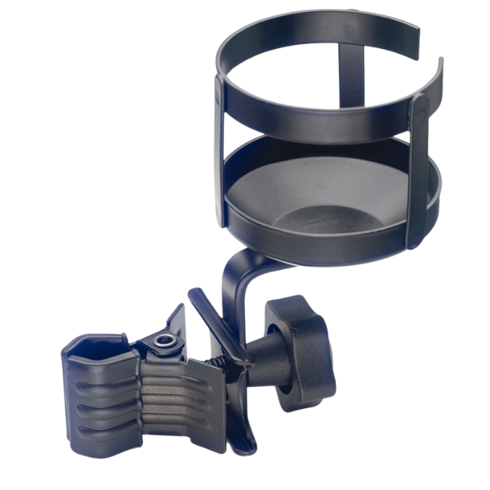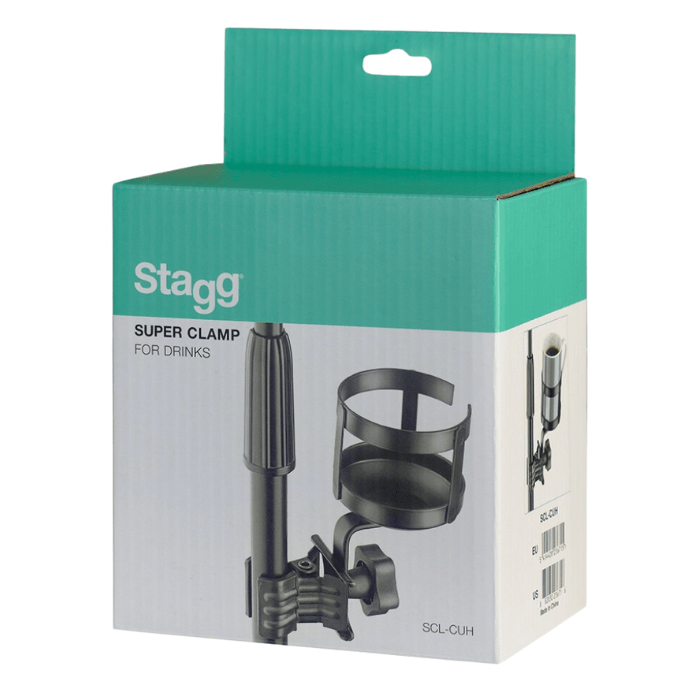 The Stagg Cup Holder w/ Clamp keeps your drink secure on any stand sized 18 mm to 45 mm. It uses a metal frame and rubber clamp for a firm hold. The 7.5 cm diameter and 7 cm depth fit most cups and bottles.