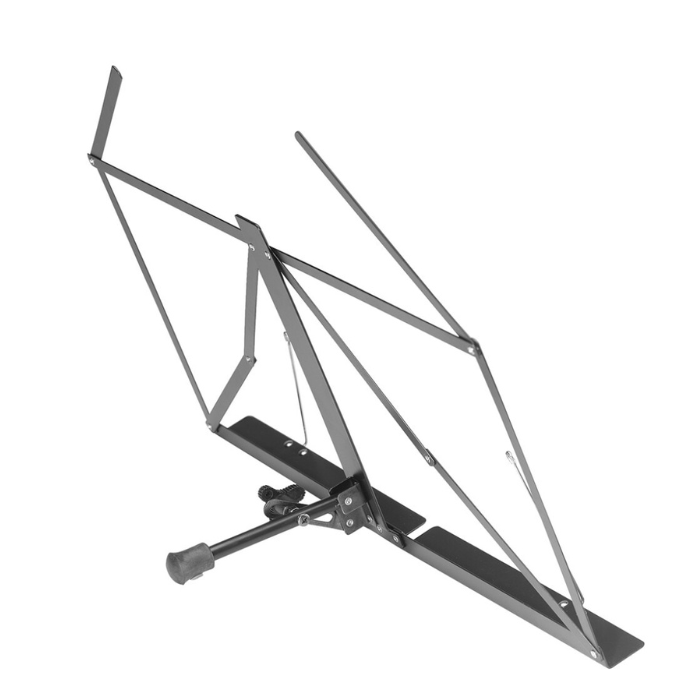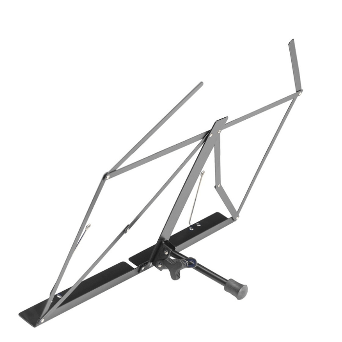 The Stagg Desktop Music Stand presents musicians with an efficient solution that conserves space by providing secure positioning on desktops or tabletops. The stand is crafted from sturdy metal materials while maintaining its capability to support both sheet music and books and tablets. The small package size of this stand permits easy fold-down convenience and a smooth fit inside its travel bag, which proves useful for students or musicians on the move.
