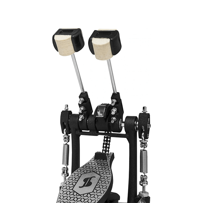 The Stagg Double Pedal w/ Double Chain is built for drummers who need power, speed, and stability. Its double-chain over-sprocket drive ensures smooth, responsive action, while the steel base plate with anti-skid rubber pad and anchor spikes keeps it locked in place. With adjustable spring tension, beater angle, and a 540° tilter, you can fine-tune your setup with ease. The 4-way beater (felt/plastic) offers versatile sound options, and the pedal easily converts into two singles using the included drive shaft, tuning tools, and extra spring pack. Finished with a memory lock for consistent setup every time, it’s a solid choice for serious players.
