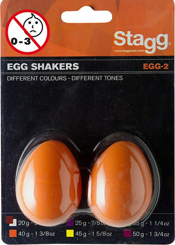 Stagg Orange Egg Shakers! Lightweight at 1 3/8 oz each, these durable plastic shakers are perfect for kids, classrooms, or any musician. Safe for ages 3 and up, they’re fun and easy to use.