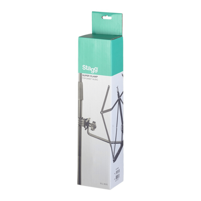 The Stagg Foldable Music Stand Arm with Clamp functions as an adjustable music keeper that attaches to different stands using its clamping mechanism. This device consists of a durable metal construction with an anti-skid rubber clamp, which can connect to cymbal stands and microphone stands as well as any tube ranging from 18 mm to 45 mm in diameter. Users can benefit from two-section adjustability and reliable, steady grip along with the reinforced screw-in clamp.