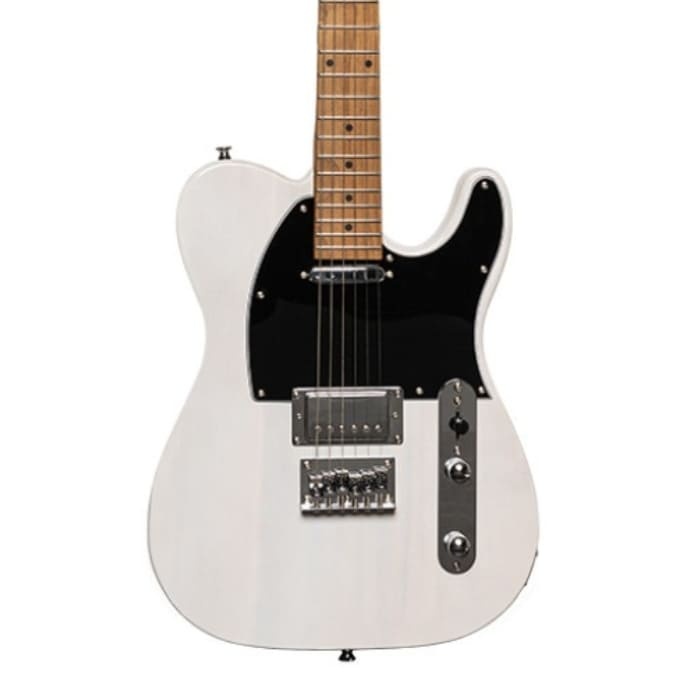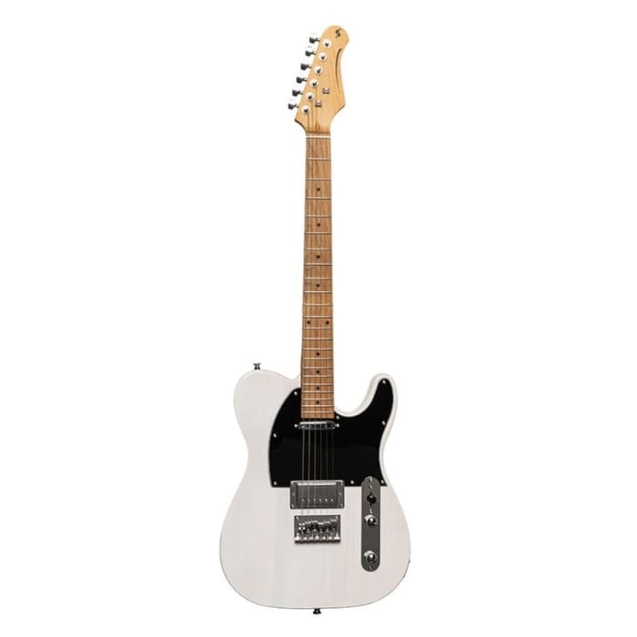 The Stagg Set-Plus WHB Vintage T Series Plus Electric Guitar White features a solid paulownia body and a satin maple neck. It has a maple fingerboard with 22 frets. The bridge humbucker includes a push-pull coil split for more tone options. The neck single coil delivers clear sounds. A string through the body bridge helps with sustain. The see thru white high gloss finish gives it a clean vintage look.
