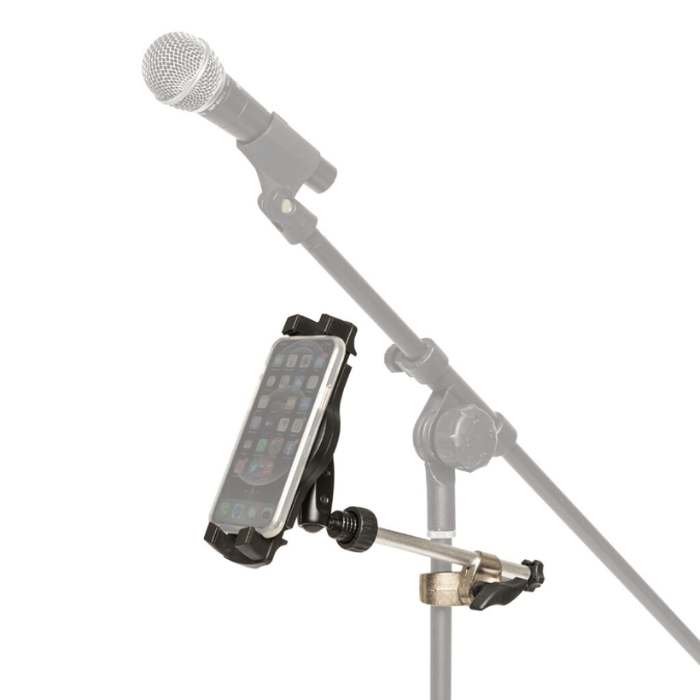 Stagg Smartphone & Tablet Holder + Accessories. The holder features both a reinforced screw-in system and a strong aluminium arm, which allows quick and easy attachment to mic stands, flat surfaces, as well as desks. This holder contains an adjustable cradle that supports many smartphone and tablet models during streaming, performances, practice sessions, and recording activities. A rotating cradle, along with an adjustable arm reaching 32 cm extendable length, enables precise viewing angles every session.