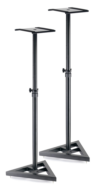 This Stagg adjustable monitor stand is made from an all steel frame, and can be adjusted in just 6 easy steps. It features a heavy triangle base with rubber feet, and levelling floor spikes to suit any flooring. The sturdy metal top plate comes with 2 anti-slip and vibration reducing rubber strips.