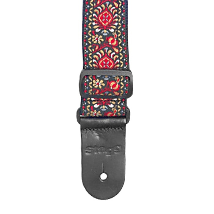 The Stagg Woven Nylon Strap in Jimi Red is a stylish and comfortable guitar accessory, featuring a 5 cm wide woven nylon body and genuine leather ends with the Stagg logo. Its adjustable length accommodates players of all sizes and styles.