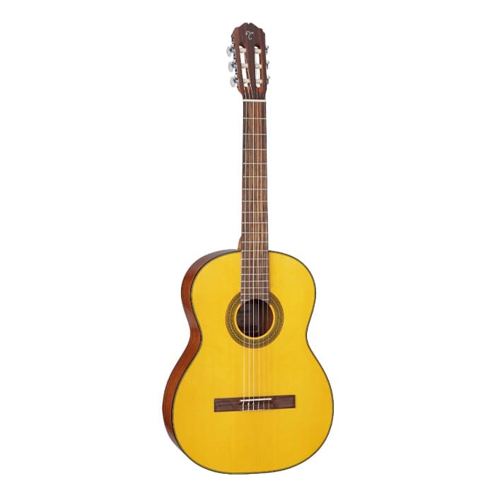The Takamine GC1 Classical Guitar Natural Gloss Spruce Top is an easy to play nylon string guitar designed for beginners. It has a spruce top for clear sound and mahogany back and sides for warmth. The wide neck helps you place your fingers correctly, while the smooth fingerboard makes playing more comfortable. It produces a soft and balanced tone that works well for learning chords and fingerstyle.
