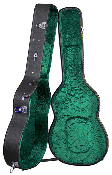 Wooden Hard Shell with Black Leatherette Outer Cover and Accented Stitching. Grey Plush Lining. Solid Grab-Handle.
