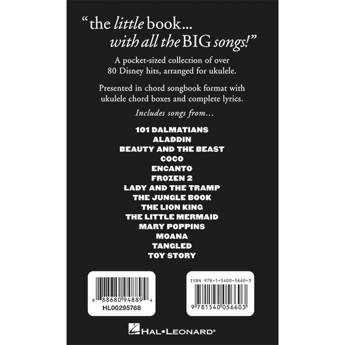 With 90 Disney songs, the Little Black Disney Songbook for Ukulele is ideal for practice sessions, performances, and sing-alongs. It is appropriate for both novice and experienced players due to its complete lyrics and unambiguous chord boxes.