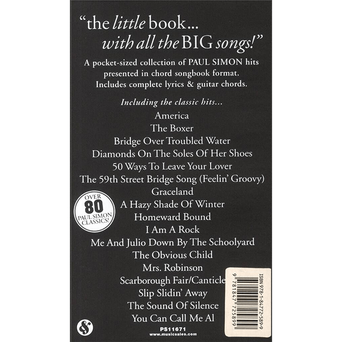 Paul Simon's Little Black Songbook includes 80 classic songs in a handy, portable style. It is fantastic for learning, practicing, or playing because it has complete lyrics, chord names, and diagrams. It is also perfect for travel, gigs, and rehearsals.