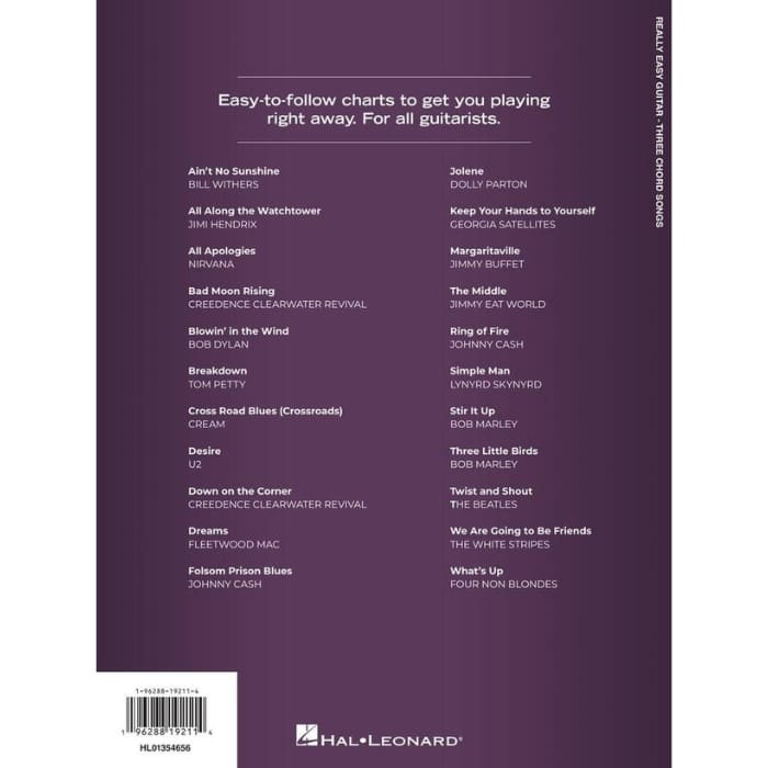 Three Chord Songs - Really Easy Guitar is a beginner-friendly book with 22 hit songs using only three chords. Each song shows lyrics, chord charts, and easy tabs. This makes it simple to learn timing, chord changes, and rhythm while playing recognizable tunes. The book helps beginners build confidence, improve finger movement, and start playing songs quickly.