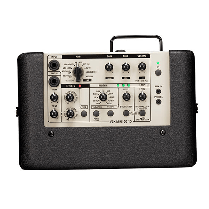 The VOX MINI GO 10 portable amp is lightweight and battery-powered. It features realistic amp models, a vocoder for vocal effects, onboard effects, mic and AUX inputs, a headphone jack, a rhythm machine with various patterns, and a looper to enhance your solo performance. Perfect for practice and gigs on the go!