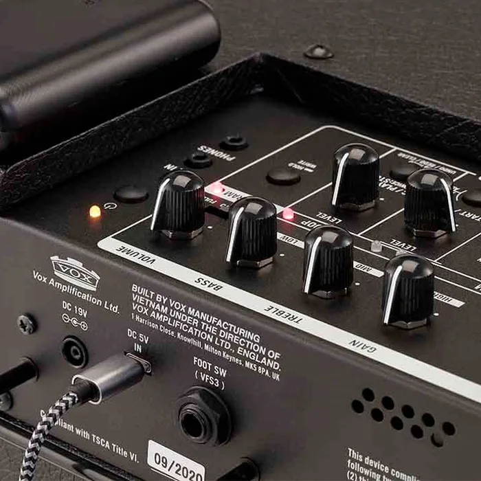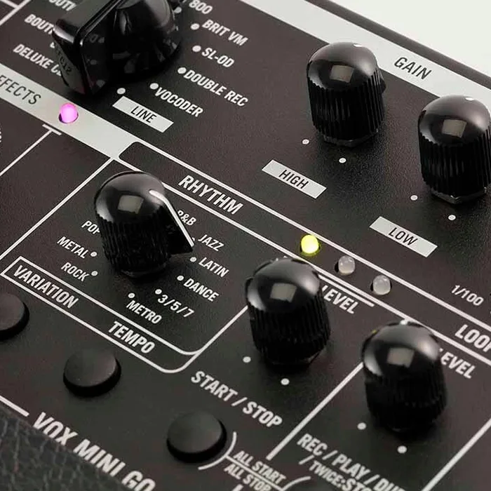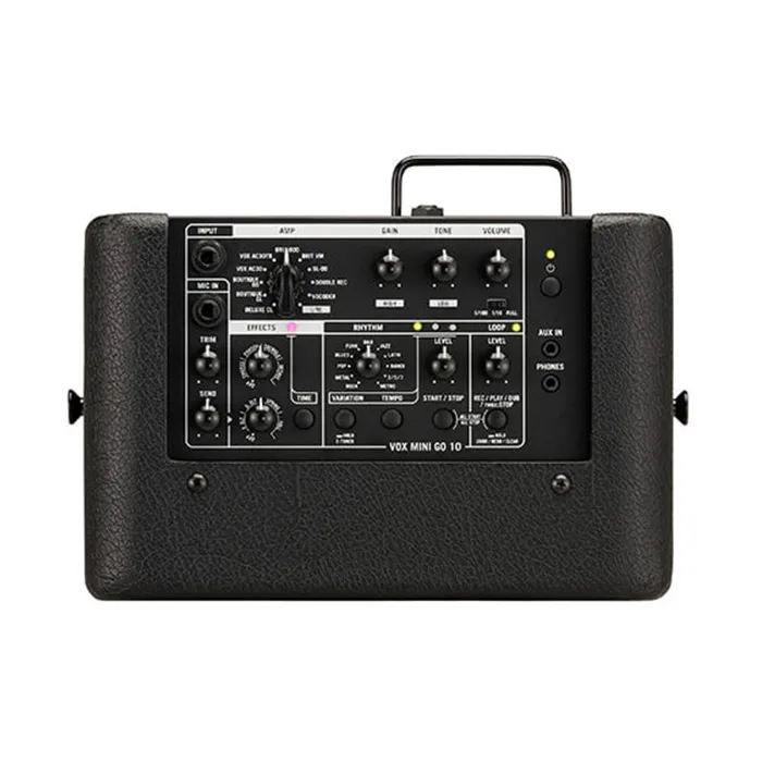The VOX MINI GO 10 presents itself as a minimalistic yet powerful amplifier designed to be usable for players both at home and during street and live shows. The portable unit operates with battery energy and includes precise amplifier models and built-in effects as well as a vocoder and microphone along with AUX and headphone interfaces and a rhythm sequencer and looping system.